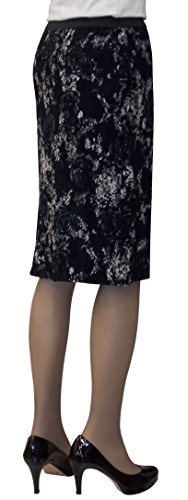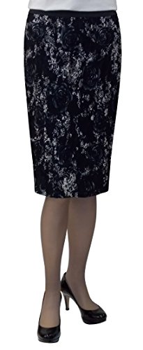 You'll look great, and feel even better in this sleek, updated, stretch knit lace pencil skirt. It's just wide enough at the bottom to walk comfortably yet narrow enough to give you that sleek lean flattering look you'll love. It's got a black stretch knit lining so there's no need for a slip and the stretchy knit fabric and print, along with the elastic waistband can be very forgiving when you need it to be. The perfect skirt for a day at the office, or a night out on the town.